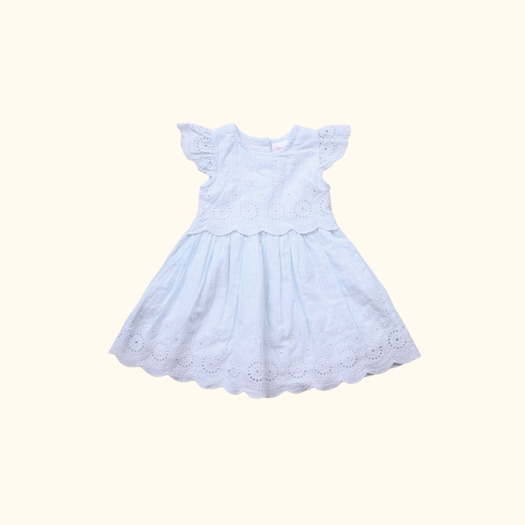 Get your little girl ready for summer with this turquoise dress! Made with 100% cotton, it's perfect for special occasions and features delicate embroidery and classic white stripes.